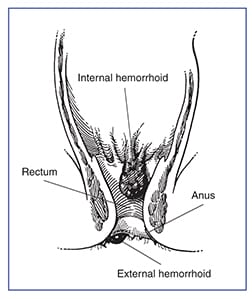 Hemorrhoids are swollen and inflamed veins around the anus or in the lower rectum. The rectum is the last part of the large intestine leading to the anus. The anus is the opening at the end of the digestive tract where bowel contents leave the body.